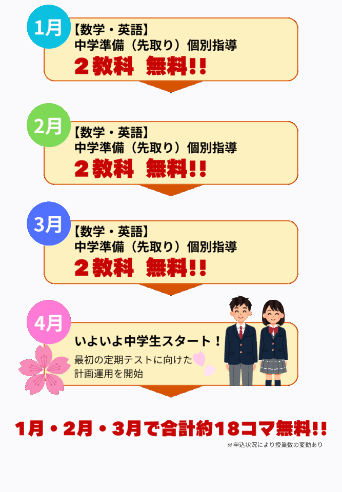 この期間、中学準備・個別指導が〈週2コマ無料〉(数学・英語)で受講できます。